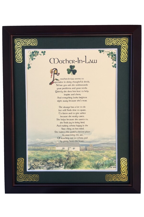 Features - Our blessings are printed on ivory card, and are presented in a forest green matting with gold Celtic knots embossed on the corners. Set behind glass and displayed in a elegant dark walnut frame of Italian design. The backing has a hanger and an attached easel to allow for both wall and tabletop display. Each frame comes individually boxed in a bubble wrap sleeve.