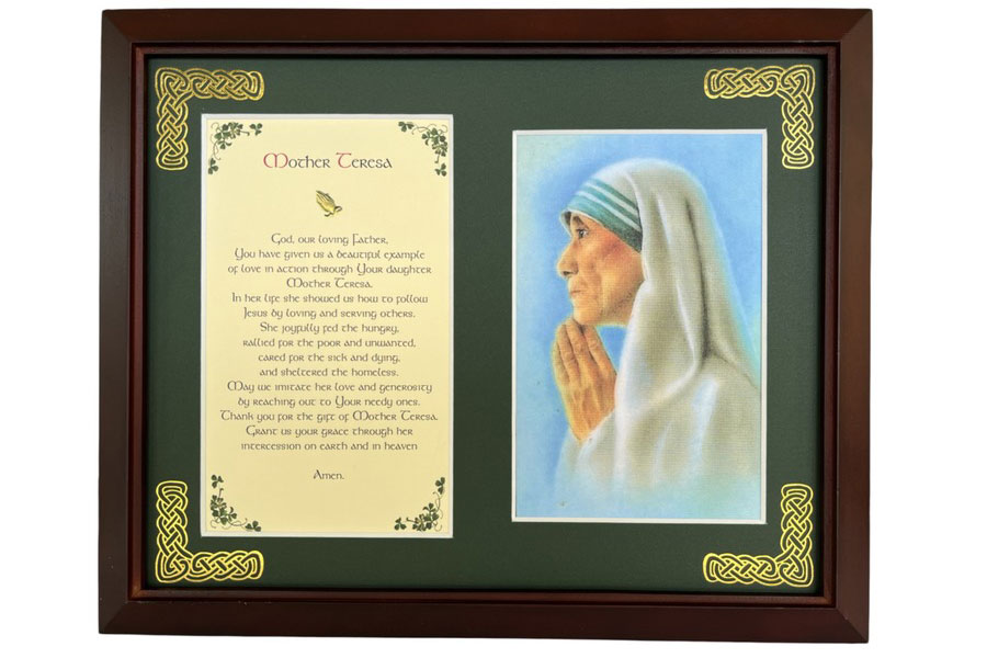 Features - Our blessings are printed on ivory card, and are presented in a forest green matting with gold Celtic knots embossed on the corners. Set behind glass and displayed in a elegant dark walnut frame of Italian design. The backing has a hanger and an attached easel to allow for both wall and table top display. The opening holds a 4x6 photo. Each frame comes individually boxed in a bubble wrap sleeve.