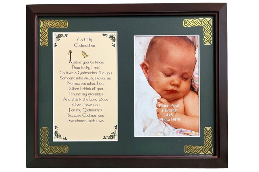 Features - Our blessings are printed on ivory card, and are presented in a forest green matting with gold Celtic knots embossed on the corners. Set behind glass and displayed in a elegant dark walnut frame of Italian design. The backing has a hanger and an attached easel to allow for both wall and table top display. The opening holds a 4x6 photo. Each frame comes individually boxed in a bubble wrap sleeve.