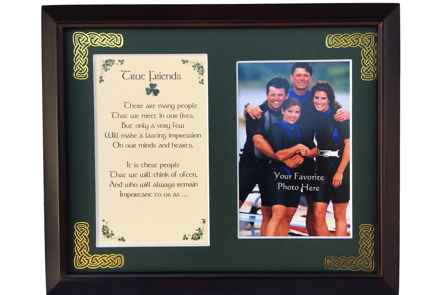 Features - Our blessings are printed on ivory card, and are presented in a forest green matting with gold Celtic knots embossed on the corners. Set behind glass and displayed in a elegant dark walnut frame of Italian design. The backing has a hanger and an attached easel to allow for both wall and table top display. The opening holds a 4x6 photo. Each frame comes individually boxed in a bubble wrap sleeve.