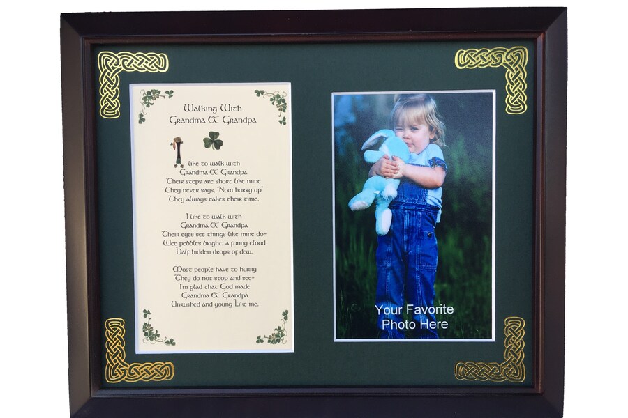 Features - Our blessings are printed on ivory card, and are presented in a forest green matting with gold Celtic knots embossed on the corners. Set behind glass and displayed in a elegant dark walnut frame of Italian design. The backing has a hanger and an attached easel to allow for both wall and table top display. The opening holds a 4x6 photo. Each frame comes individually boxed in a bubble wrap sleeve.