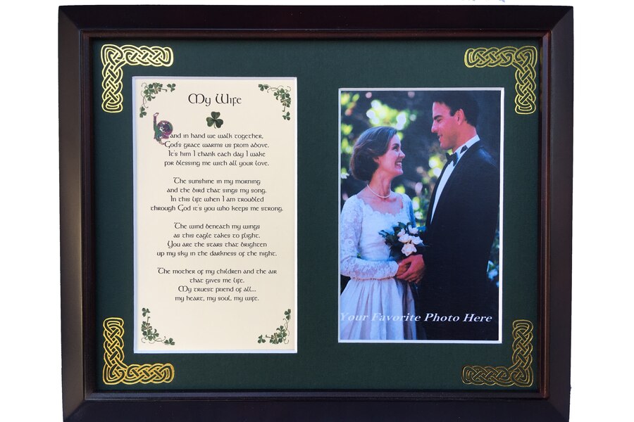 Features - Our blessings are printed on ivory card, and are presented in a forest green matting with gold Celtic knots embossed on the corners. Set behind glass and displayed in a elegant dark walnut frame of Italian design. The backing has a hanger and an attached easel to allow for both wall and table top display. The opening holds a 4x6 photo. Each frame comes individually boxed in a bubble wrap sleeve.