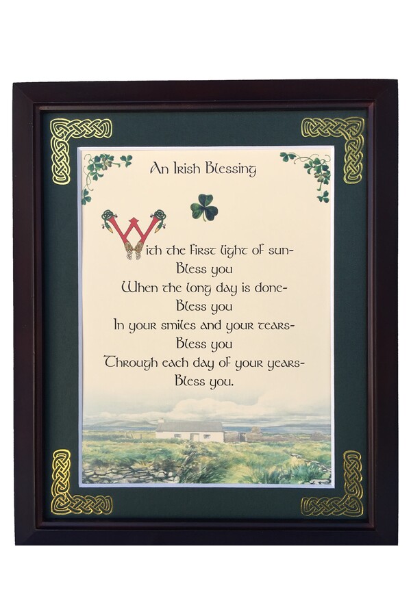 Features - Our blessings are printed on ivory card, and are presented in a forest green matting with gold Celtic knots embossed on the corners. Set behind glass and displayed in a elegant dark walnut frame of Italian design. The backing has a hanger and an attached easel to allow for both wall and tabletop display. Each frame comes individually boxed in a bubble wrap sleeve.