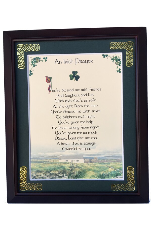 Features - Our blessings are printed on ivory card, and are presented in a forest green matting with gold Celtic knots embossed on the corners. Set behind glass and displayed in a elegant dark walnut frame of Italian design. The backing has a hanger and an attached easel to allow for both wall and tabletop display. Each frame comes individually boxed in a bubble wrap sleeve.