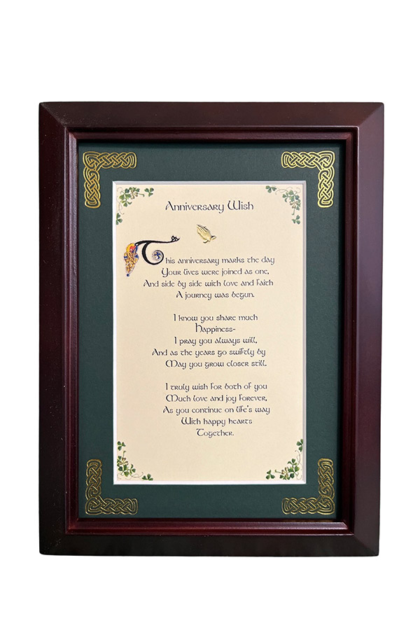 Features - Our blessings are printed on an ivory card, and are presented in a forest green matting with gold Celtic knots, embossed on the corners. Set behind glass and displayed in an elegant dark walnut frame of Italian design. The backing has a hanger and an attached easel to allow for both wall and tabletop display. Each frame comes individually boxed in a bubble wrap sleeve.