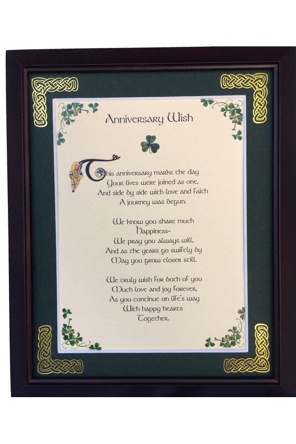 Features - Our blessings are printed on ivory card, and are presented in a forest green matting with gold Celtic knots embossed on the corners. Set behind glass and displayed in a elegant dark walnut frame of Italian design. The backing has a hanger and an attached easel to allow for both wall and tabletop display. Each frame comes individually boxed in a bubble wrap sleeve.
