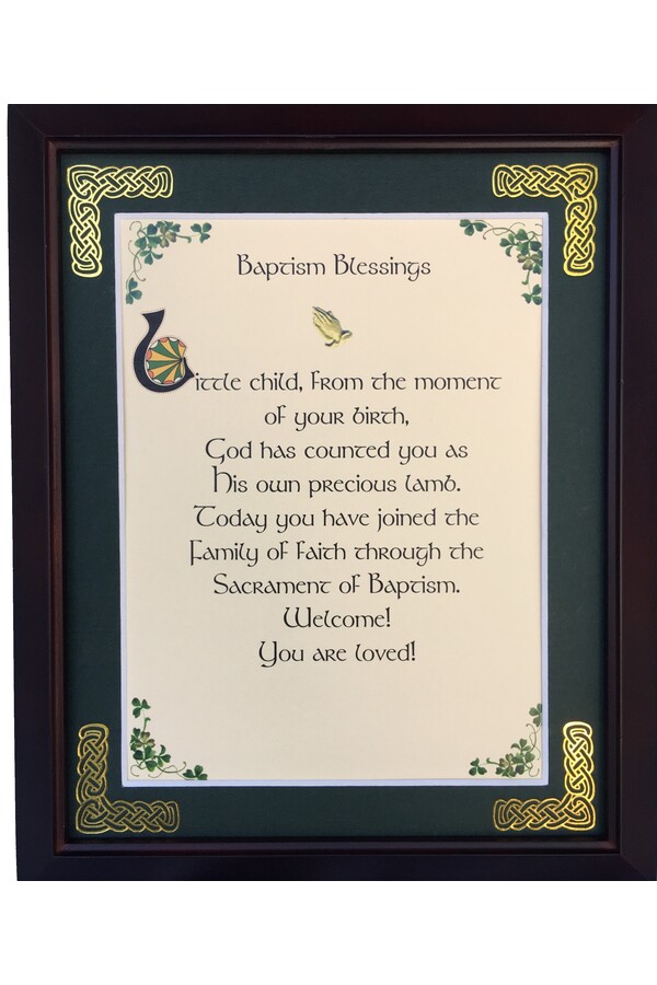 Features - Our blessings are printed on ivory card, and are presented in a forest green matting with gold Celtic knots embossed on the corners. Set behind glass and displayed in a elegant dark walnut frame of Italian design. The backing has a hanger and an attached easel to allow for both wall and tabletop display. Each frame comes individually boxed in a bubble wrap sleeve.