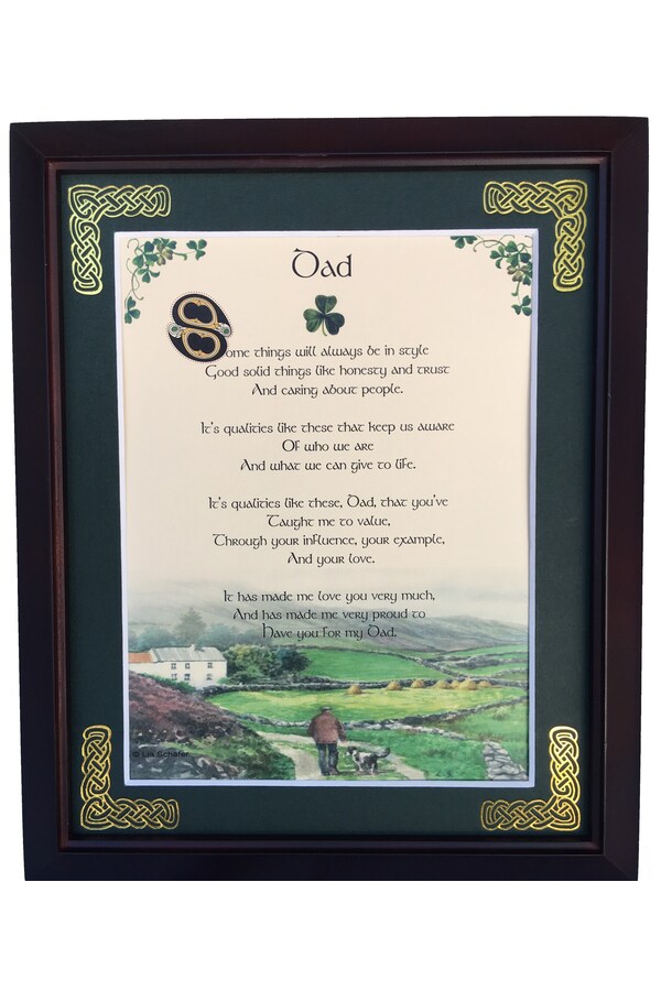 Features - Our blessings are printed on ivory card, and are presented in a forest green matting with gold Celtic knots embossed on the corners. Set behind glass and displayed in a elegant dark walnut frame of Italian design. The backing has a hanger and an attached easel to allow for both wall and tabletop display. Each frame comes individually boxed in a bubble wrap sleeve.
