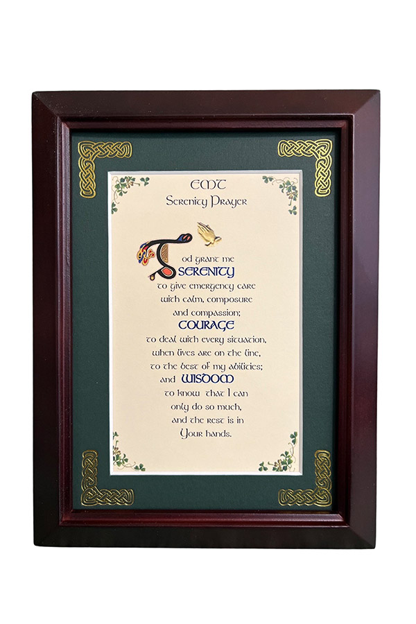 Features - Our blessings are printed on an ivory card, and are presented in a forest green matting with gold Celtic knots, embossed on the corners. Set behind glass and displayed in an elegant dark walnut frame of Italian design. The backing has a hanger and an attached easel to allow for both wall and tabletop display. Each frame comes individually boxed in a bubble wrap sleeve.