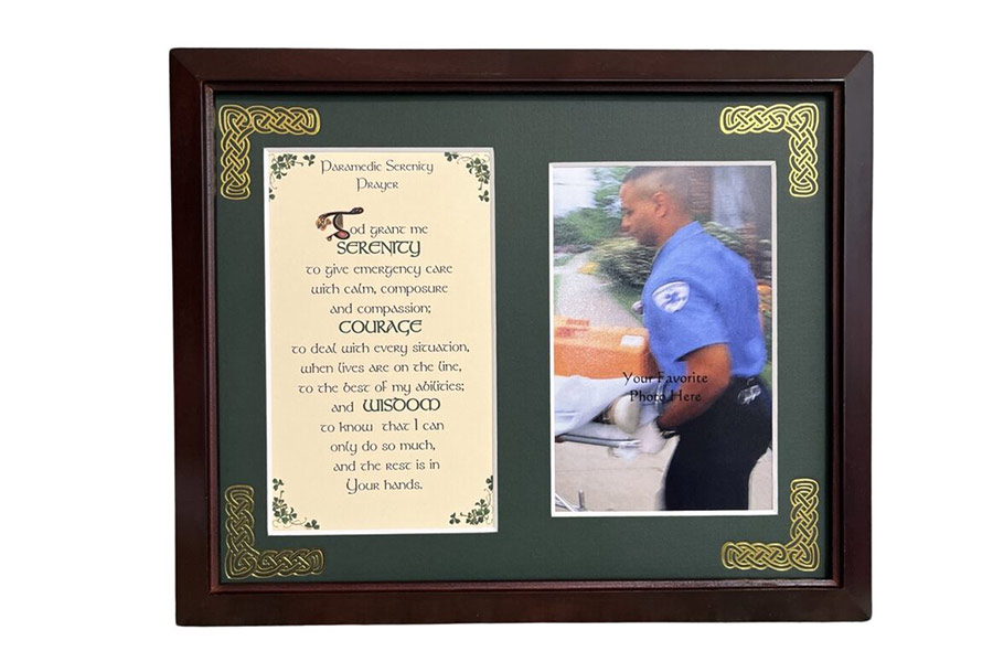 Features - Our blessings are printed on ivory card, and are presented in a forest green matting with gold Celtic knots embossed on the corners. Set behind glass and displayed in a elegant dark walnut frame of Italian design. The backing has a hanger and an attached easel to allow for both wall and table top display. The opening holds a 4x6 photo. Each frame comes individually boxed in a bubble wrap sleeve.