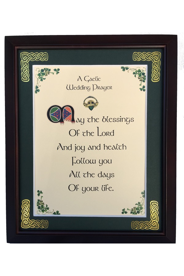 Features - Our blessings are printed on ivory card, and are presented in a forest green matting with gold Celtic knots embossed on the corners. Set behind glass and displayed in a elegant dark walnut frame of Italian design. The backing has a hanger and an attached easel to allow for both wall and tabletop display. Each frame comes individually boxed in a bubble wrap sleeve.