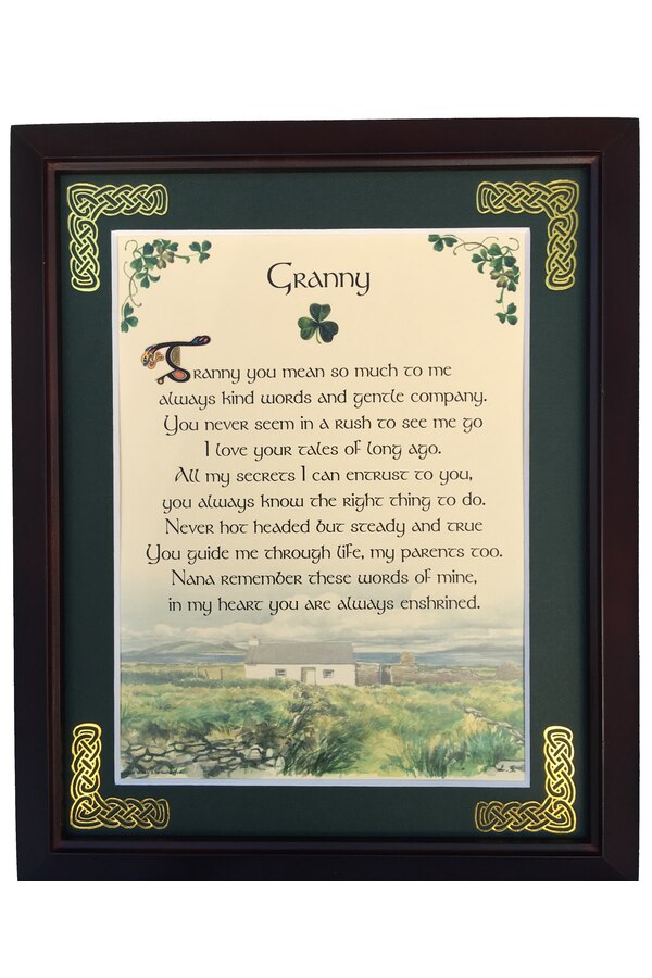 Features - Our blessings are printed on ivory card, and are presented in a forest green matting with gold Celtic knots embossed on the corners. Set behind glass and displayed in a elegant dark walnut frame of Italian design. The backing has a hanger and an attached easel to allow for both wall and tabletop display. Each frame comes individually boxed in a bubble wrap sleeve.