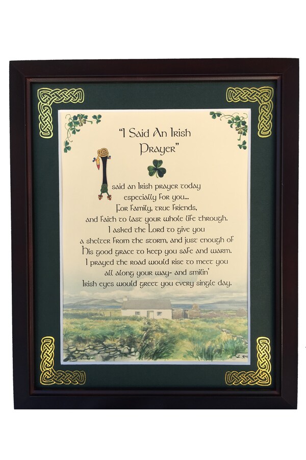 Features - Our blessings are printed on ivory card, and are presented in a forest green matting with gold Celtic knots embossed on the corners. Set behind glass and displayed in a elegant dark walnut frame of Italian design. The backing has a hanger and an attached easel to allow for both wall and tabletop display. Each frame comes individually boxed in a bubble wrap sleeve.