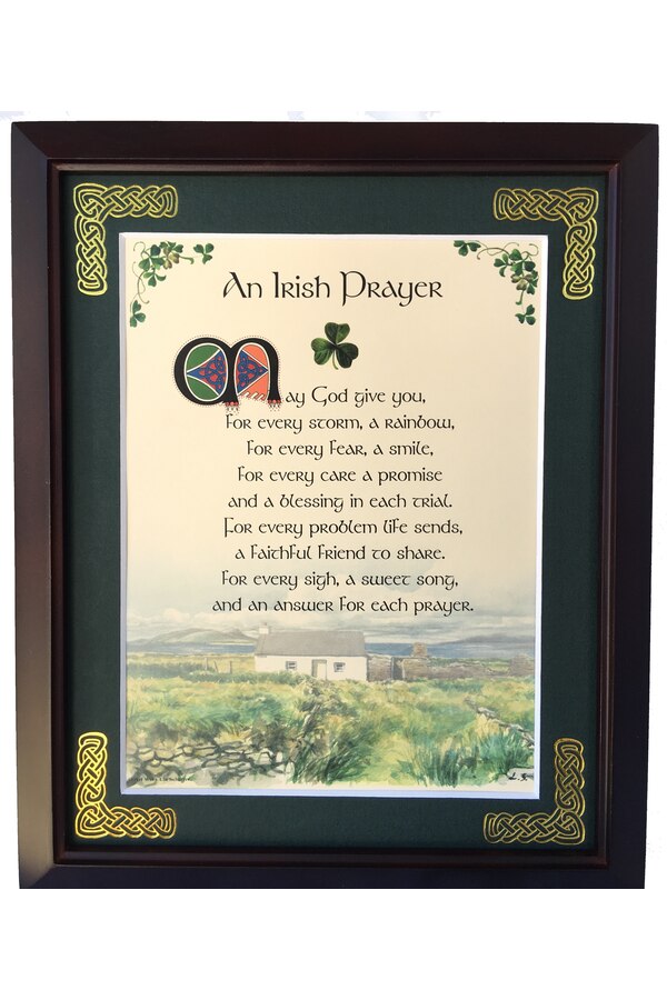 Features - Our blessings are printed on ivory card, and are presented in a forest green matting with gold Celtic knots embossed on the corners. Set behind glass and displayed in a elegant dark walnut frame of Italian design. The backing has a hanger and an attached easel to allow for both wall and tabletop display. Each frame comes individually boxed in a bubble wrap sleeve.
