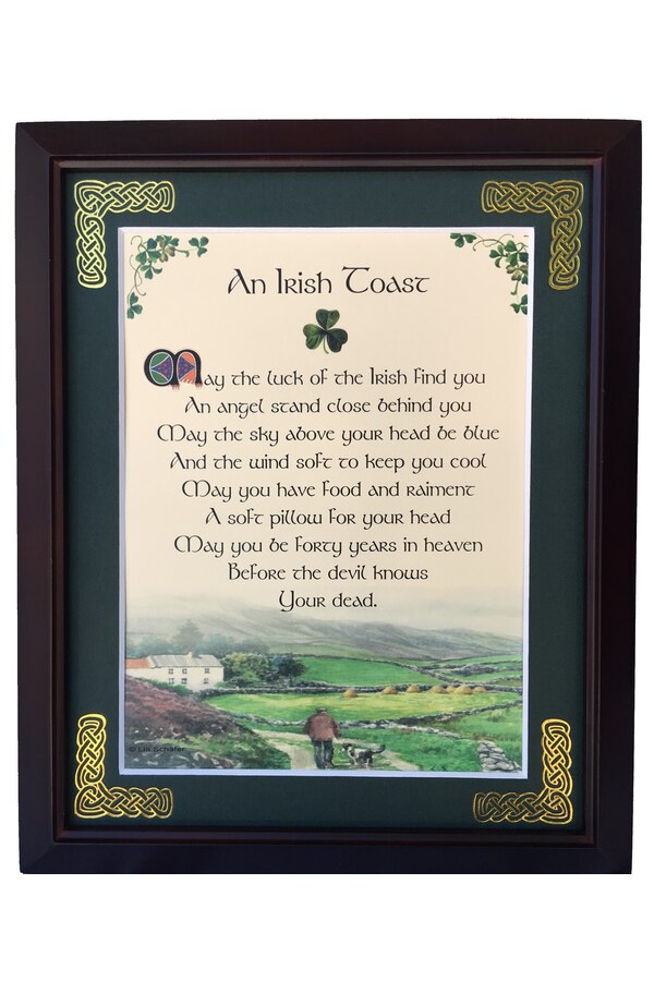 Features - Our blessings are printed on ivory card, and are presented in a forest green matting with gold Celtic knots embossed on the corners. Set behind glass and displayed in a elegant dark walnut frame of Italian design. The backing has a hanger and an attached easel to allow for both wall and tabletop display. Each frame comes individually boxed in a bubble wrap sleeve.