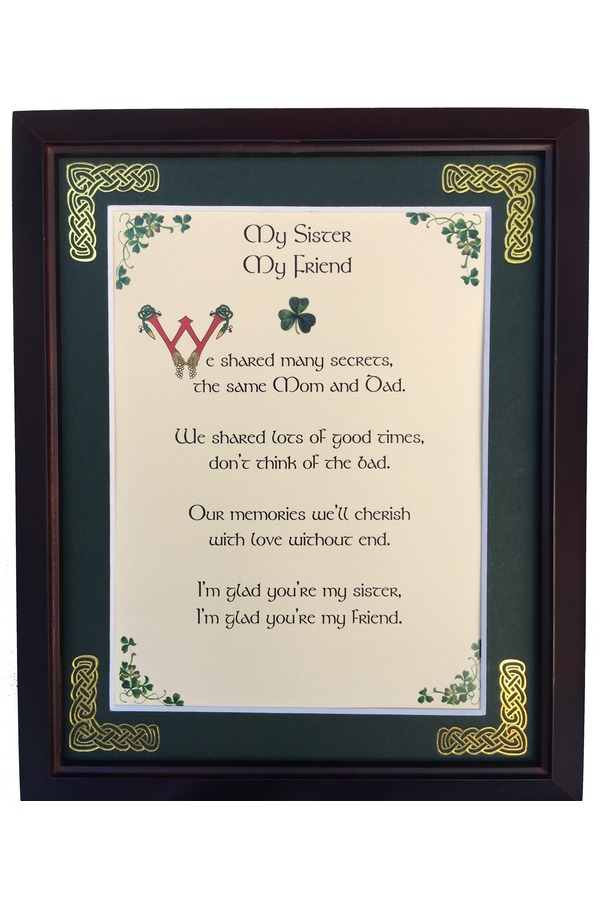 Features - Our blessings are printed on ivory card, and are presented in a forest green matting with gold Celtic knots embossed on the corners. Set behind glass and displayed in a elegant dark walnut frame of Italian design. The backing has a hanger and an attached easel to allow for both wall and tabletop display. Each frame comes individually boxed in a bubble wrap sleeve.