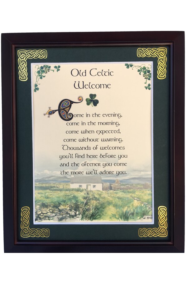 Features - Our blessings are printed on ivory card, and are presented in a forest green matting with gold Celtic knots embossed on the corners. Set behind glass and displayed in a elegant dark walnut frame of Italian design. The backing has a hanger and an attached easel to allow for both wall and tabletop display. Each frame comes individually boxed in a bubble wrap sleeve.