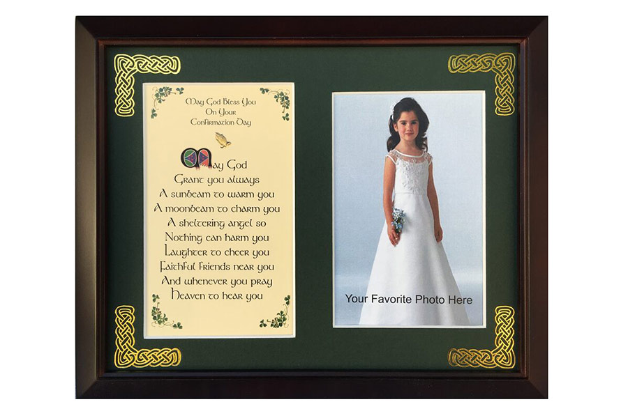 Features - Our blessings are printed on ivory card, and are presented in a forest green matting with gold Celtic knots embossed on the corners. Set behind glass and displayed in a elegant dark walnut frame of Italian design. The backing has a hanger and an attached easel to allow for both wall and table top display. The opening holds a 4x6 photo. Each frame comes individually boxed in a bubble wrap sleeve.