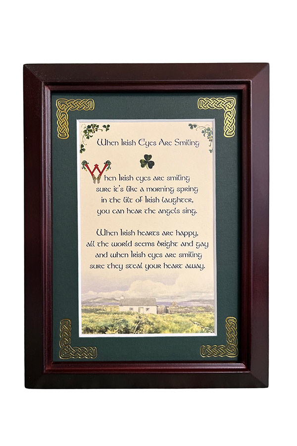 Features - Our blessings are printed on an ivory card, and are presented in a forest green matting with gold Celtic knots, embossed on the corners. Set behind glass and displayed in an elegant dark walnut frame of Italian design. The backing has a hanger and an attached easel to allow for both wall and tabletop display. Each frame comes individually boxed in a bubble wrap sleeve.
