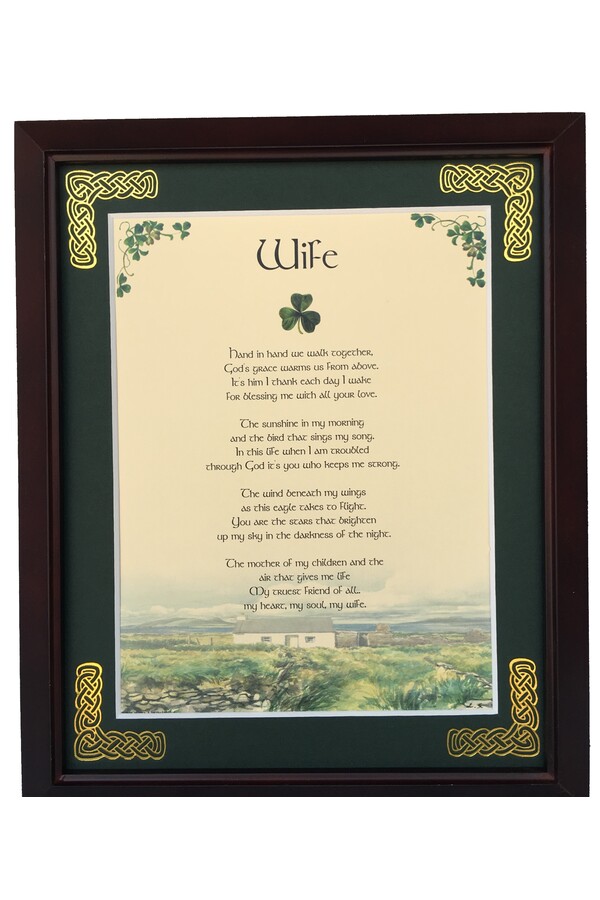 Features - Our blessings are printed on ivory card, and are presented in a forest green matting with gold Celtic knots embossed on the corners. Set behind glass and displayed in a elegant dark walnut frame of Italian design. The backing has a hanger and an attached easel to allow for both wall and tabletop display. Each frame comes individually boxed in a bubble wrap sleeve.