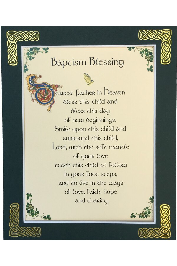 Features - Our blessings are printed on ivory card and are presented in a forest green matting with gold Celtic knots embossed on the corners. Presented in a clear with a craft card backing in a resealable bag.