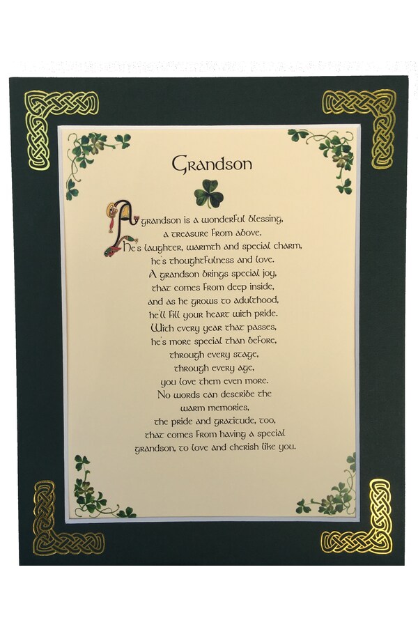 Features - Our blessings are printed on ivory card and are presented in a forest green matting with gold Celtic knots embossed on the corners. Presented in a clear with a craft card backing in a resealable bag.