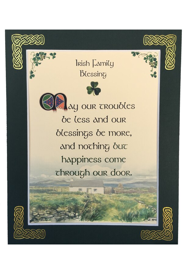 Features - Our blessings are printed on ivory card and are presented in a forest green matting with gold Celtic knots embossed on the corners. Presented in a clear with a craft card backing in a resealable bag.