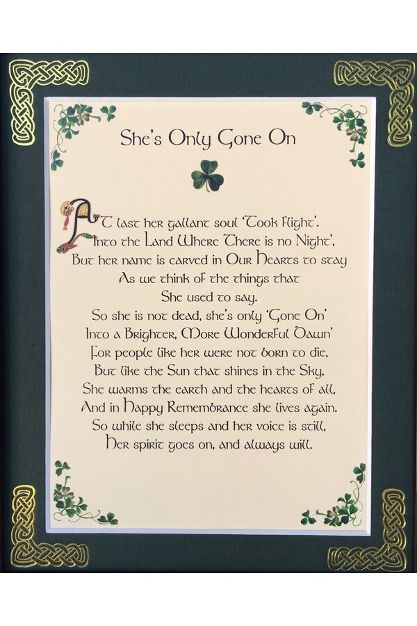 Features - Our blessings are printed on ivory card and are presented in a forest green matting with gold Celtic knots embossed on the corners. Presented in a clear with a craft card backing in a resealable bag.