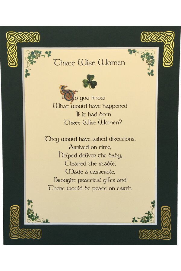 Features - Our blessings are printed on ivory card and are presented in a forest green matting with gold Celtic knots embossed on the corners. Presented in a clear with a craft card backing in a resealable bag.