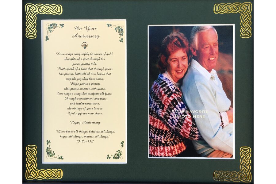 Features - Our blessings printed on ivory card are presented in a forest green matting with gold Celtic knots embossed on the corners. The opening holds a 4x6 photo. Each matt comes in a resealable sleeve.