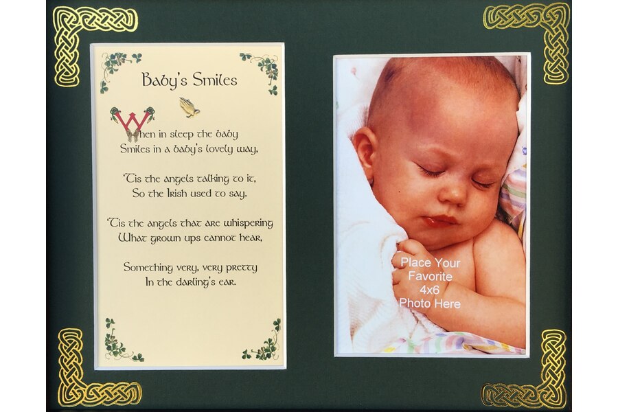 Features - Our blessings printed on ivory card are presented in a forest green matting with gold Celtic knots embossed on the corners. The opening holds a 4x6 photo. Each matt comes in a resealable sleeve.