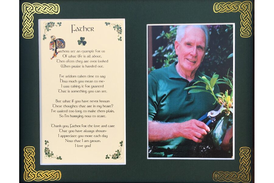 Features - Our blessings printed on ivory card are presented in a forest green matting with gold Celtic knots embossed on the corners. The opening holds a 4x6 photo. Each matt comes in a resealable sleeve.