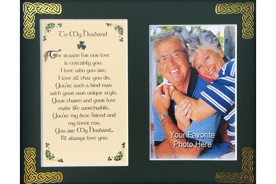 Features - Our blessings printed on ivory card are presented in a forest green matting with gold Celtic knots embossed on the corners. The opening holds a 4x6 photo. Each matt comes in a resealable sleeve.