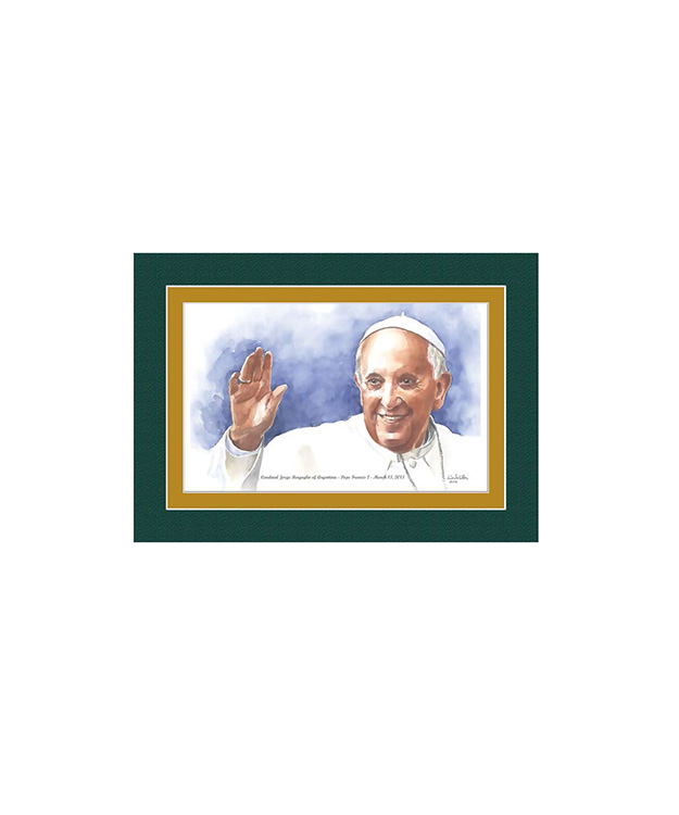 This 5"x7" watercolor print has a green over gold matting is printed directly on to the print.The print is presented in a crystal clear bag with a backing board.
