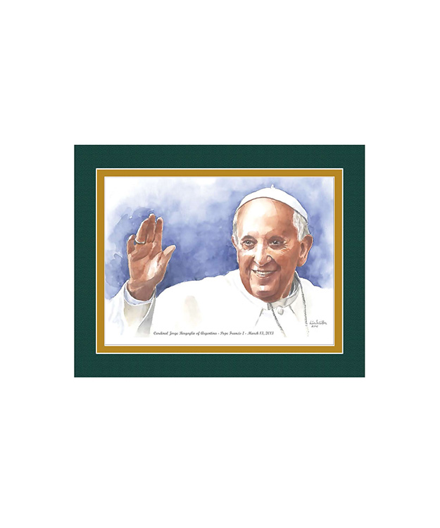 This 8"x10" watercolor print has a green over gold matting is printed directly on to the print.The print is presented in a crystal clear bag with a backing board.