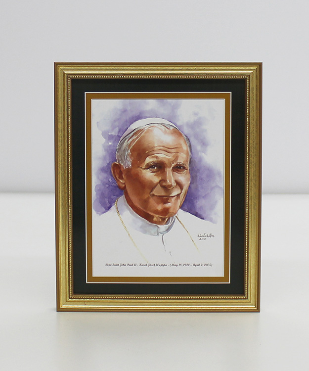 This 8"x10" watercolor print comes in a gold gilt wood frame behind plexiglass and has a wall hanging hook for easy display. The green over gold matting is printed directly on to the print. The ornate detail and high quality wrap of this solid wood frame showcase a rich gold finish. High-quality printing gives this fine art print its vivid and sharp appearance. Produced on heavy weight cover stock, this art reproduction is coated with a silken finish that protects the inks and creates an elegant look.