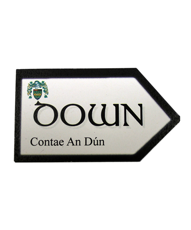 Down County Road Sign Magnet - with Gaelic translation & County Coat of Arms - Individually packaged in hanging display bag.