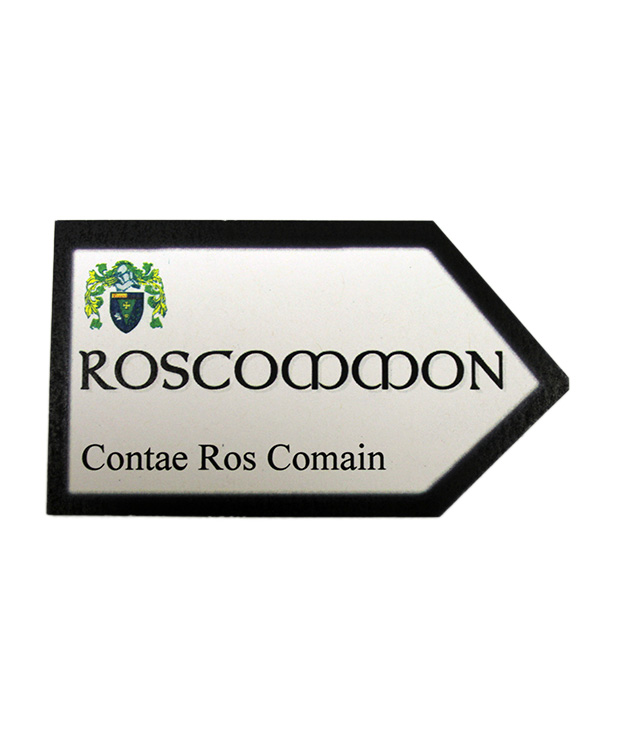 Roscommon County Road Sign Magnet - with Gaelic translation & County Coat of Arms - Individually packaged in hanging display bag.
