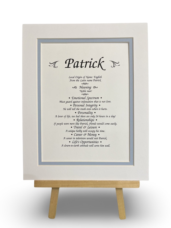 This beautiful, matted print displayed in a white over baby blue matt is printed on a white card stock, text includes the local origin of the name, meaning, emotional spectrum, personal integrity, personality, relationships, travel & leisure, career & money, life's opportunities, played in a resealable display bag. Each name meaning print has its name and number secured to the corner with a sticker, names have an A-Z dividers for easy searching of a specific name. We also take special orders for those hard to find names. We can make and send you any name with any spelling..