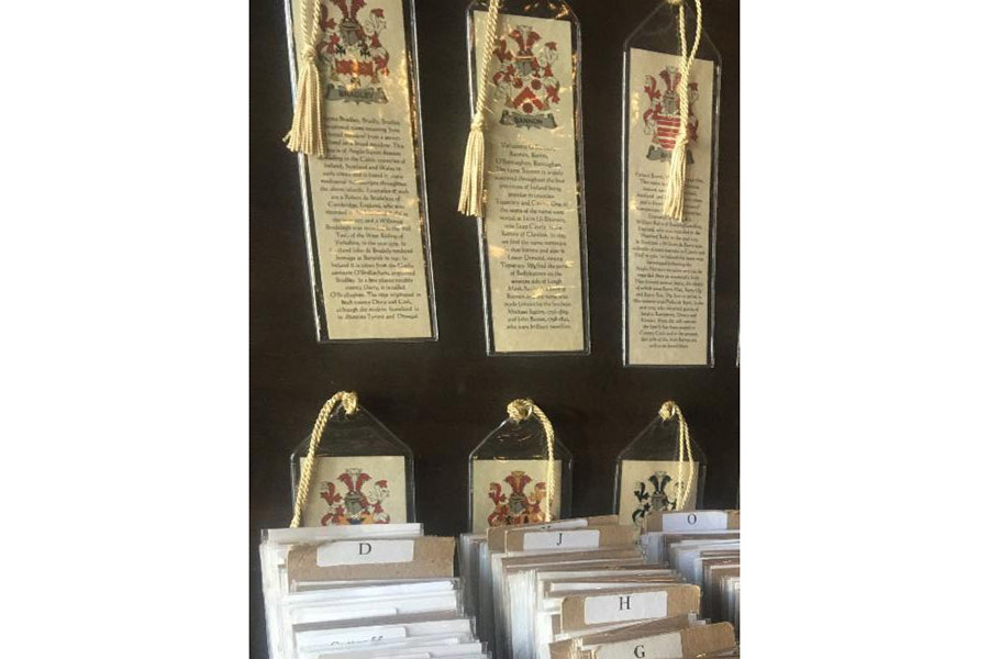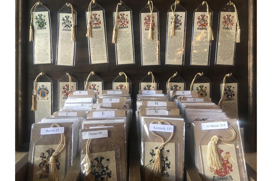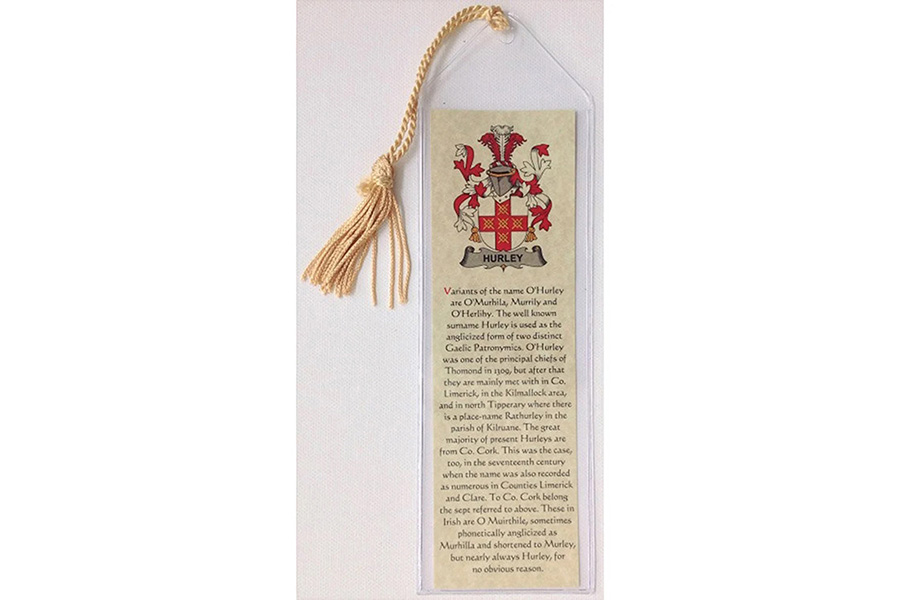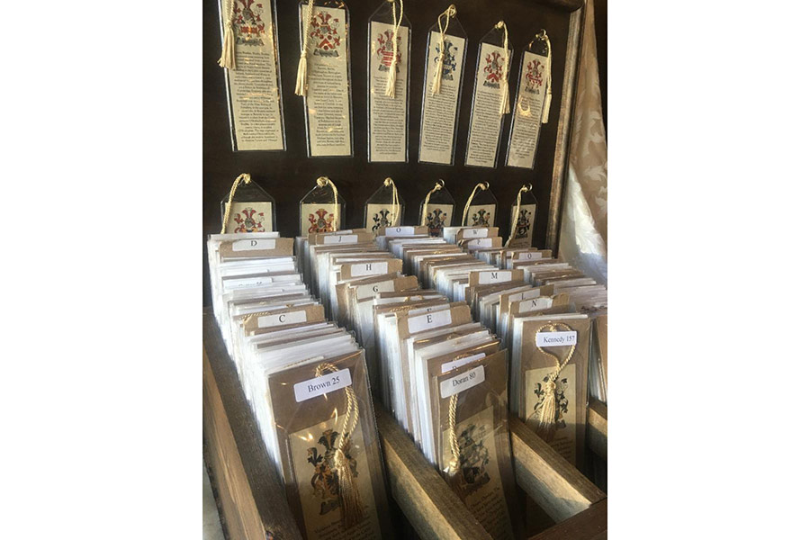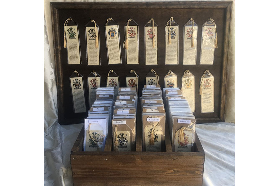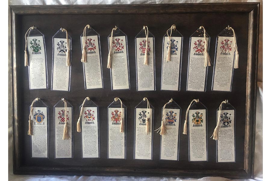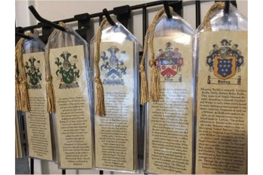 Each handmade book mark has the Coat of Arms and History on a aged parchment card stock placed in a secure vinyl bookmark sleeve, at the top is a hole with an attached gold thread tassel.
