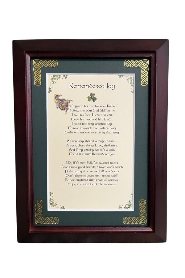 Features - Our blessings are printed on an ivory card, and are presented in a forest green matting with gold Celtic knots, embossed on the corners. Set behind glass and displayed in an elegant dark walnut frame of Italian design. The backing has a hanger and an attached easel to allow for both wall and tabletop display. Each frame comes individually boxed in a bubble wrap sleeve.