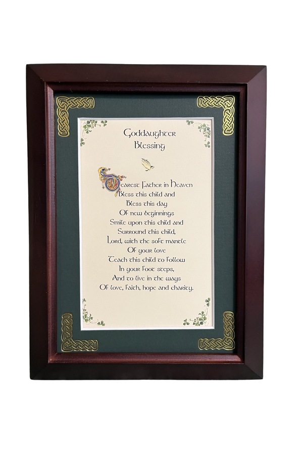 Features - Our blessings are printed on an ivory card, and are presented in a forest green matting with gold Celtic knots, embossed on the corners. Set behind glass and displayed in an elegant dark walnut frame of Italian design. The backing has a hanger and an attached easel to allow for both wall and tabletop display. Each frame comes individually boxed in a bubble wrap sleeve.