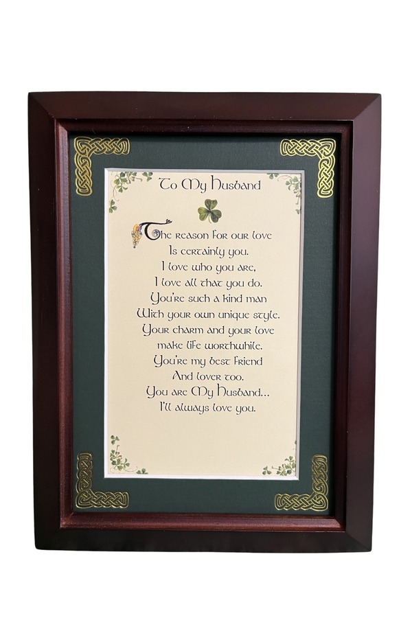 Features - Our blessings are printed on an ivory card, and are presented in a forest green matting with gold Celtic knots, embossed on the corners. Set behind glass and displayed in an elegant dark walnut frame of Italian design. The backing has a hanger and an attached easel to allow for both wall and tabletop display. Each frame comes individually boxed in a bubble wrap sleeve.